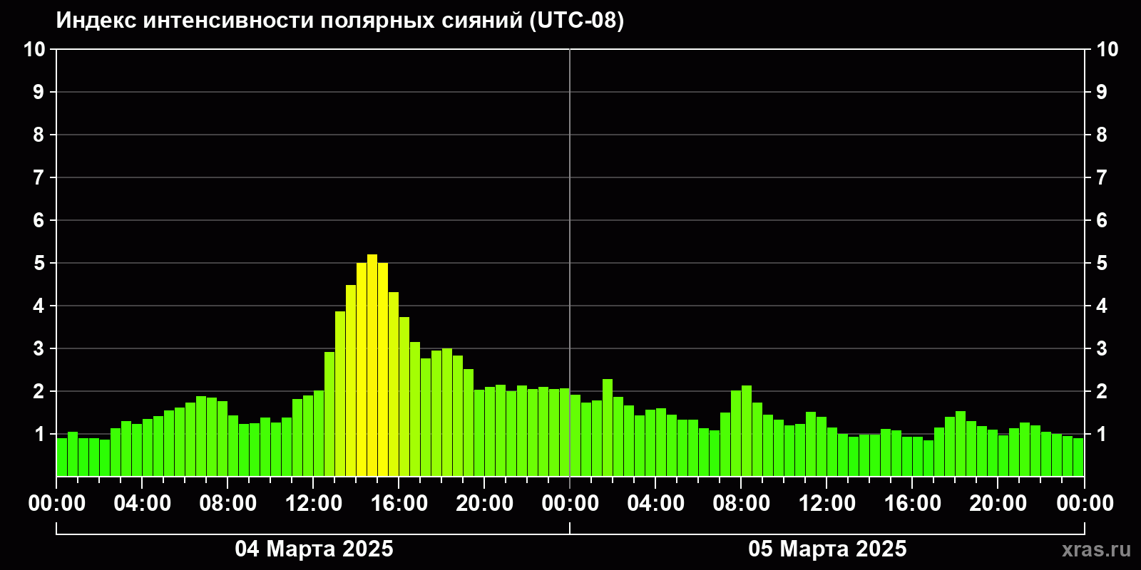 Изменения индекса интенсивности полярных сияний с 2025-03-04 по 2025-03-05 по местному времени
