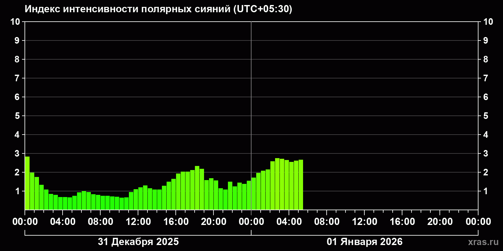 Изменения индекса интенсивности полярных сияний с 2025-12-31 по 2026-01-01 по местному времени