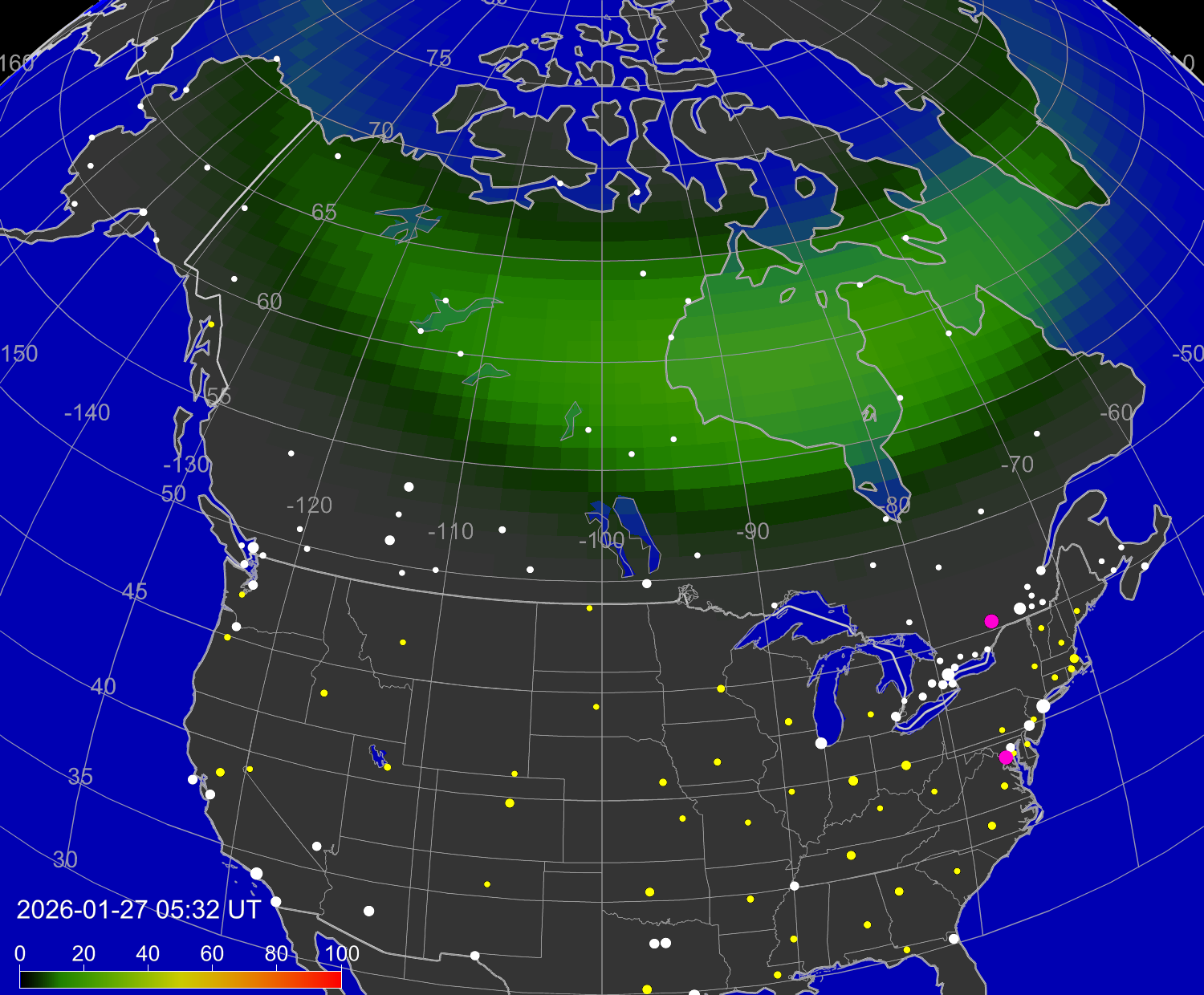 Индекс интенсивности полярных сияний и теоретически возможная широта наблюдений для ночного времени в западном полушарии