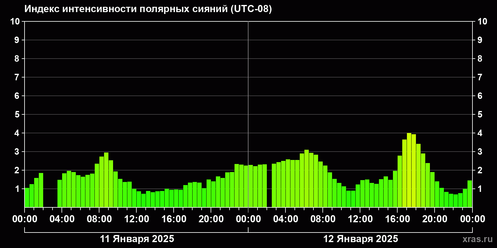 Изменения индекса интенсивности полярных сияний с 2025-01-11 по 2025-01-12 по местному времени