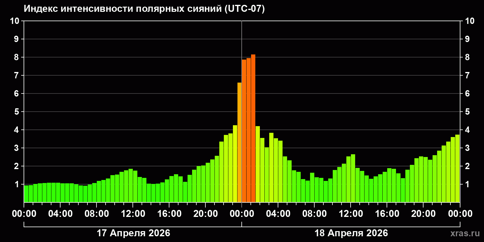 Изменения индекса интенсивности полярных сияний с 2026-04-17 по 2026-04-18 по местному времени