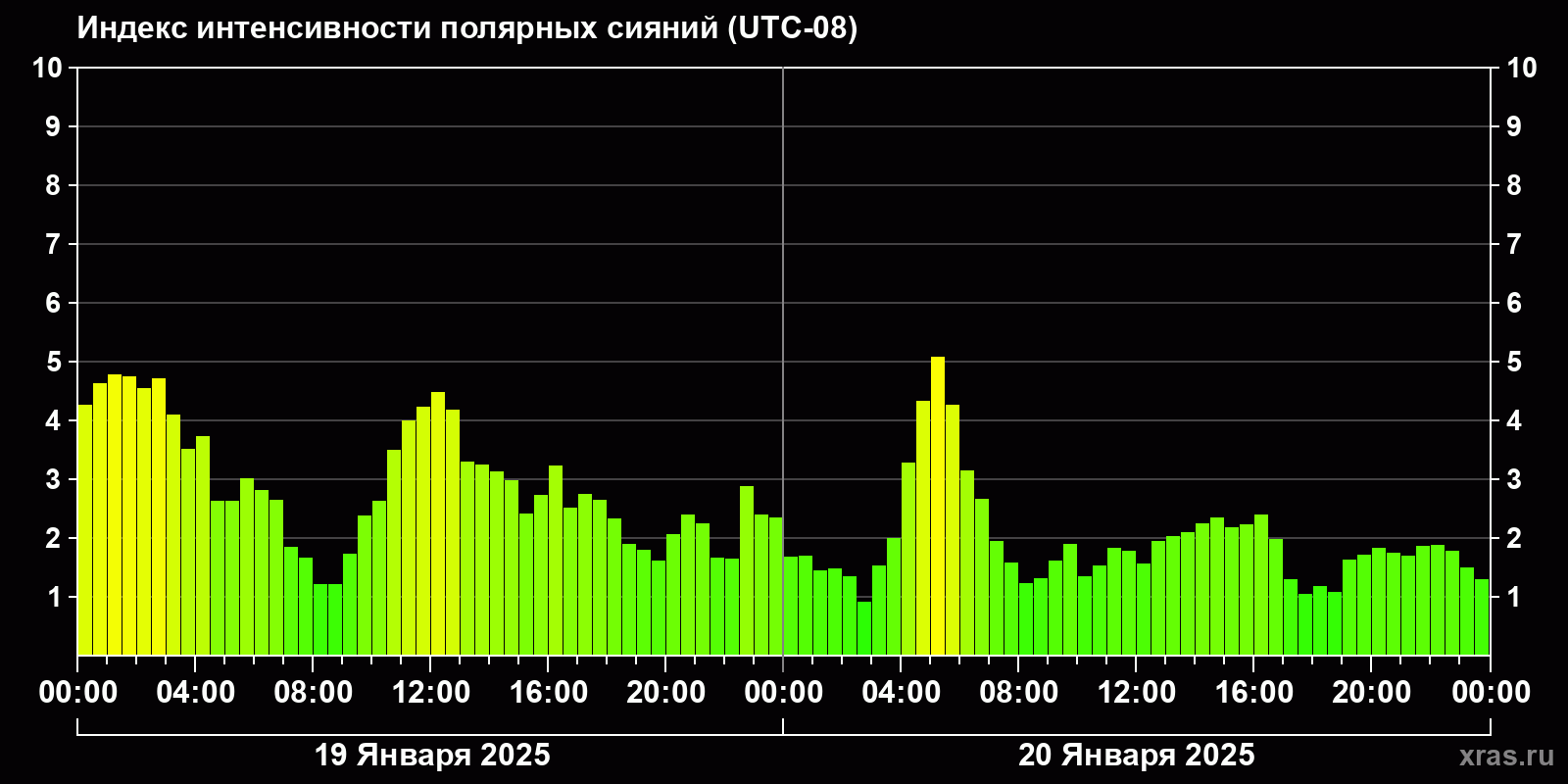 Изменения индекса интенсивности полярных сияний с 2025-01-19 по 2025-01-20 по местному времени