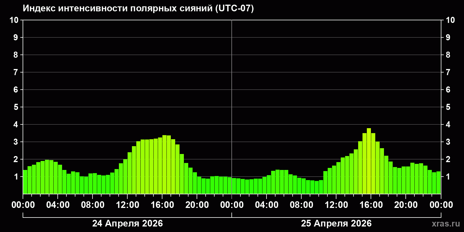 Изменения индекса интенсивности полярных сияний с 2026-04-24 по 2026-04-25 по местному времени