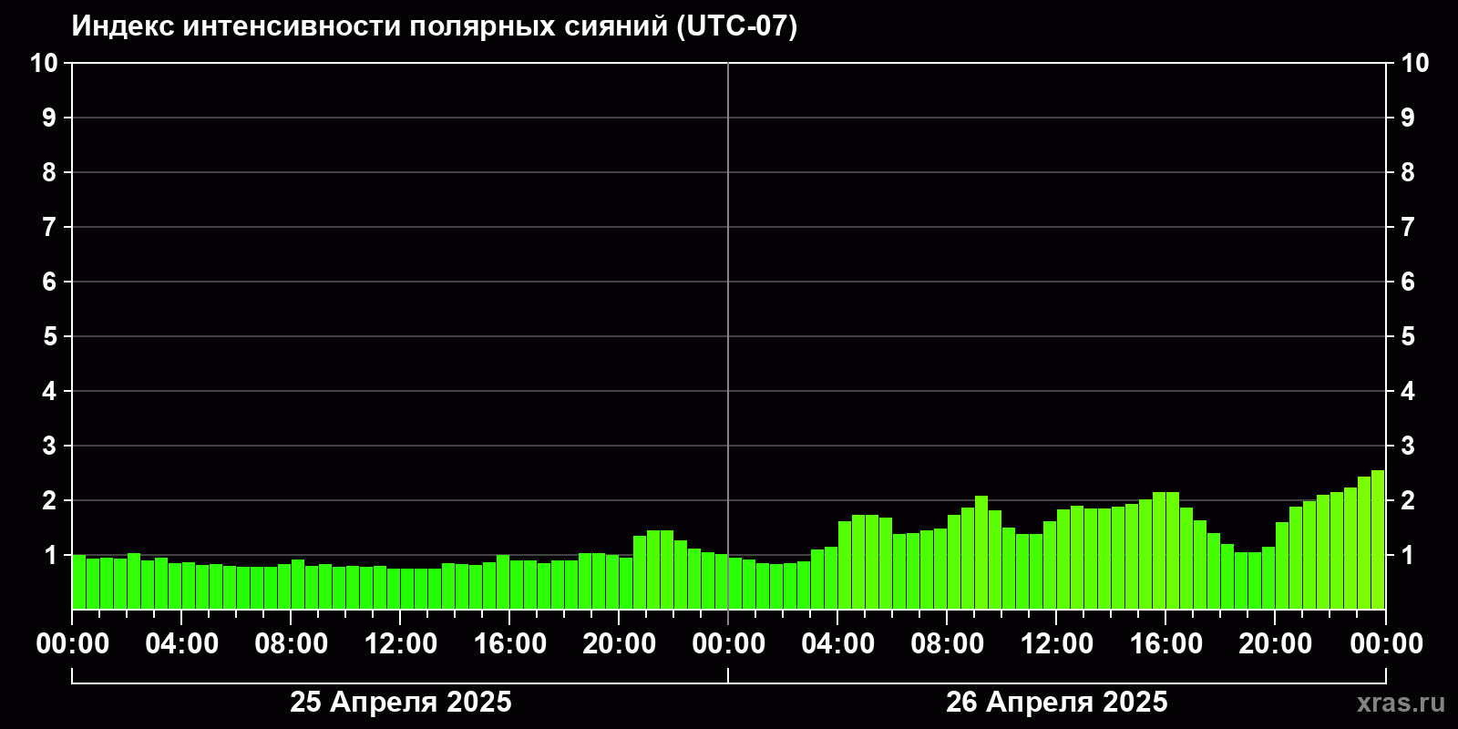 Изменения индекса интенсивности полярных сияний с 2025-04-25 по 2025-04-26 по местному времени