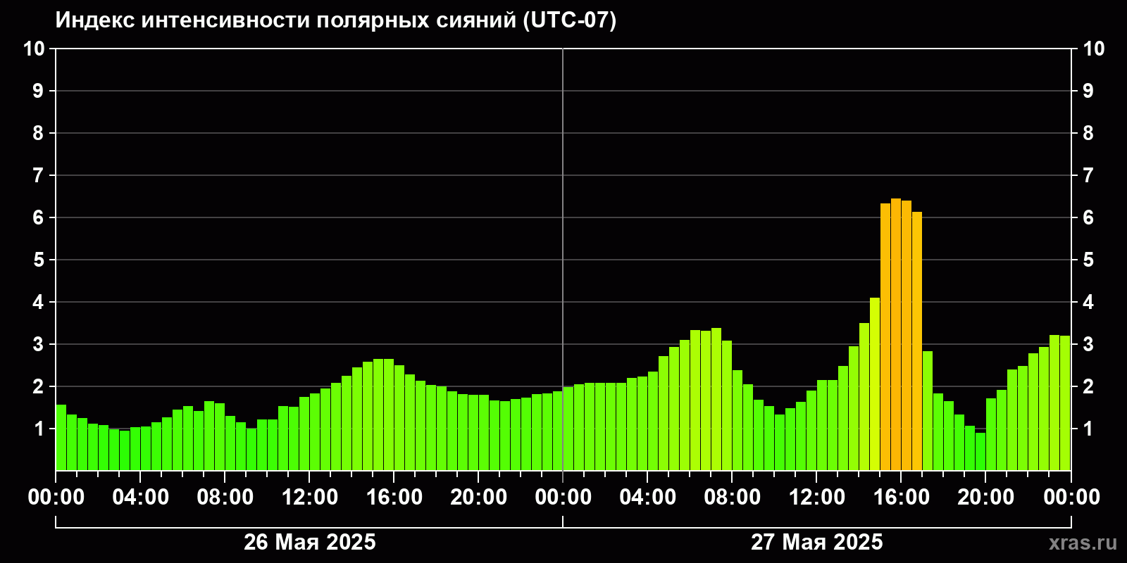 Изменения индекса интенсивности полярных сияний с 2025-05-26 по 2025-05-27 по местному времени