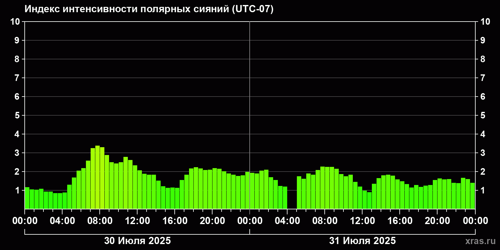 Изменения индекса интенсивности полярных сияний с 2025-07-30 по 2025-07-31 по местному времени