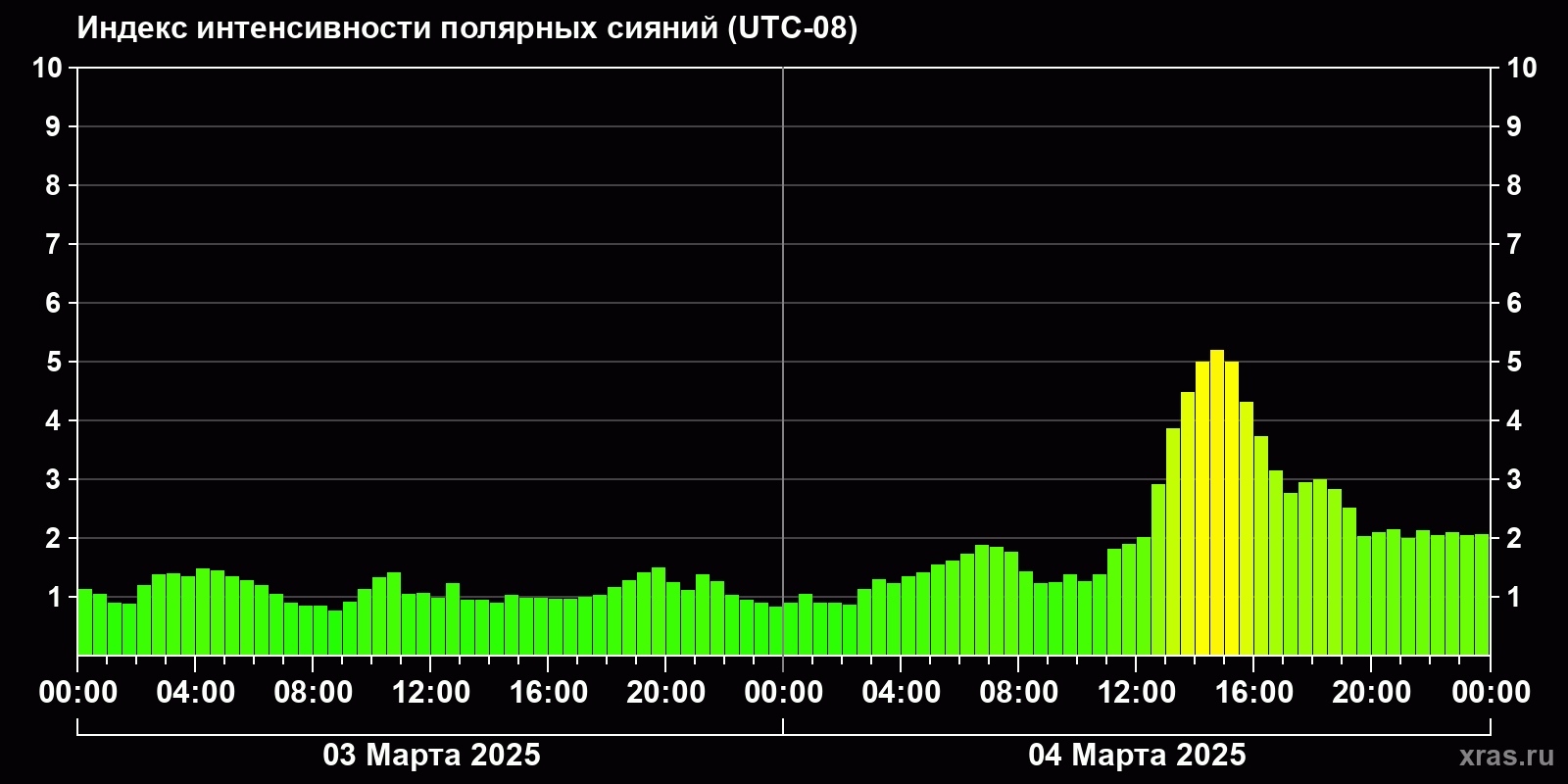 Изменения индекса интенсивности полярных сияний с 2025-03-03 по 2025-03-04 по местному времени