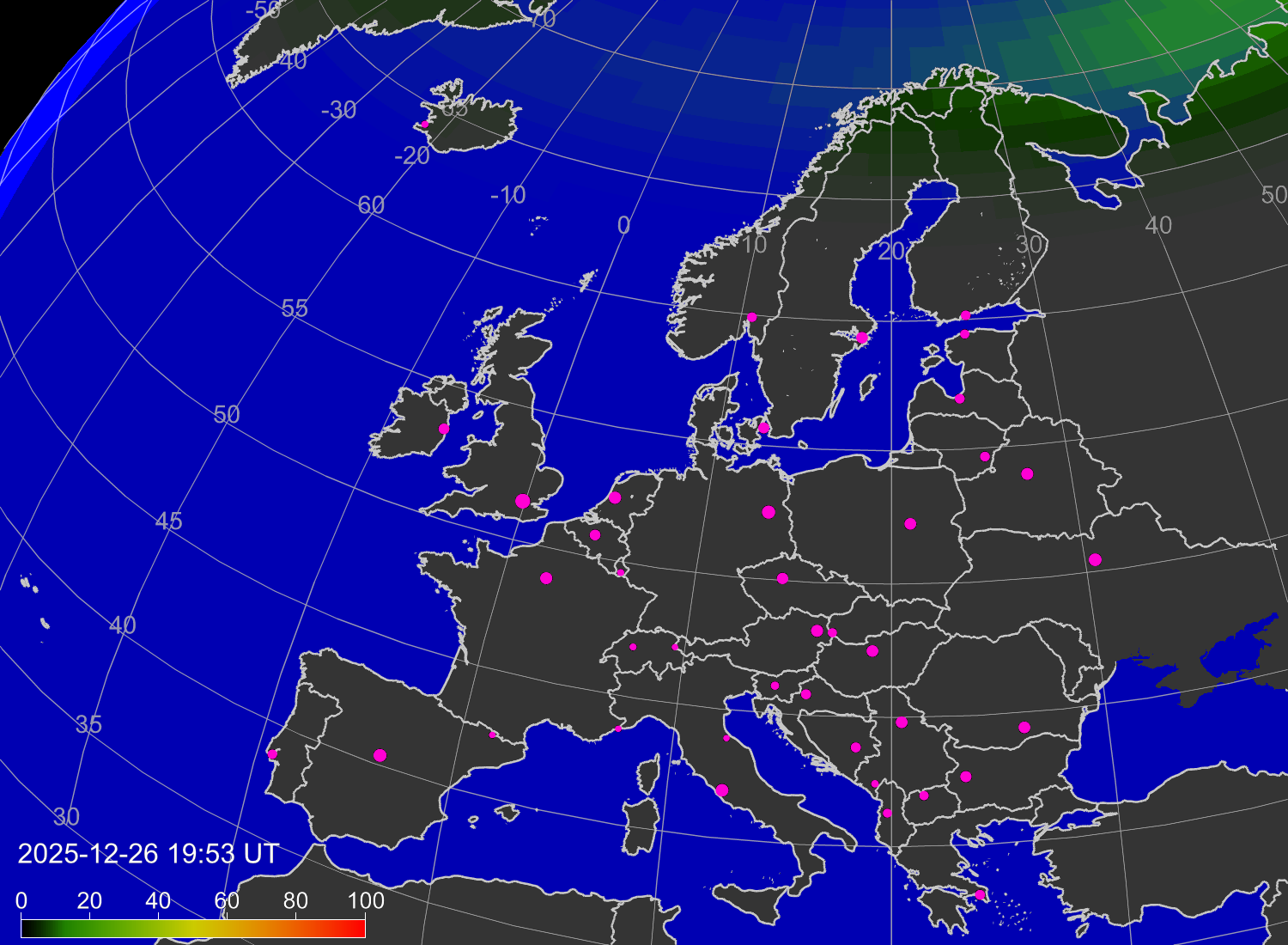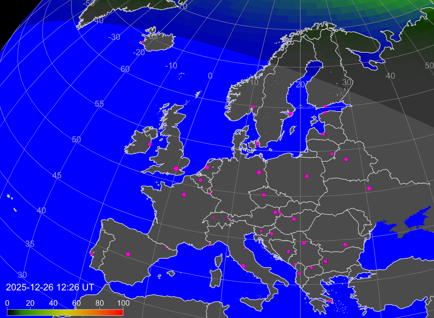 Индекс интенсивности полярных сияний и теоретически возможная широта наблюдений для ночного времени в восточном полушарии