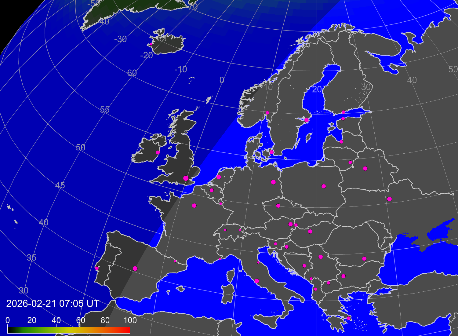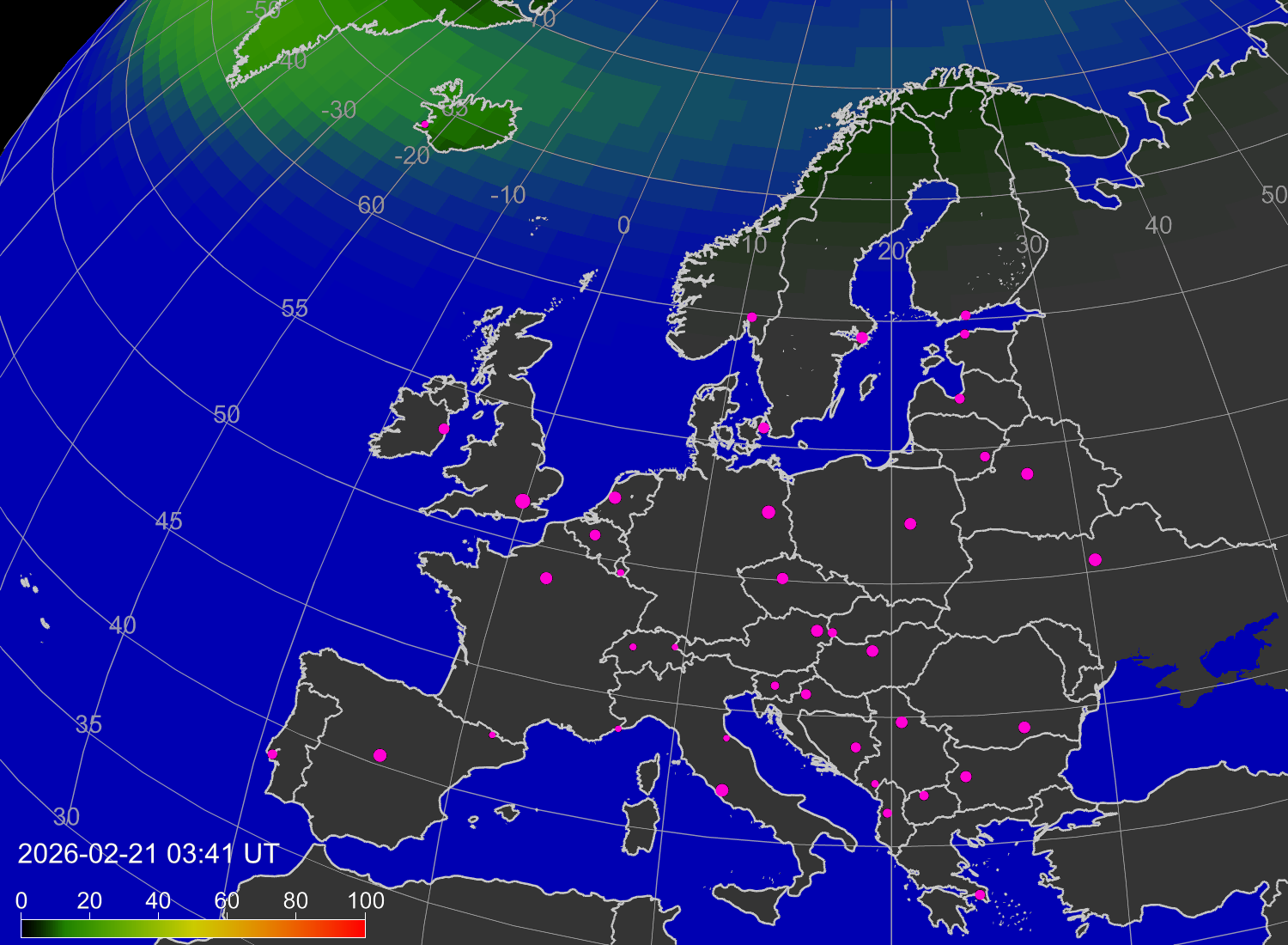 Вероятность полярных сияний в городах Европы