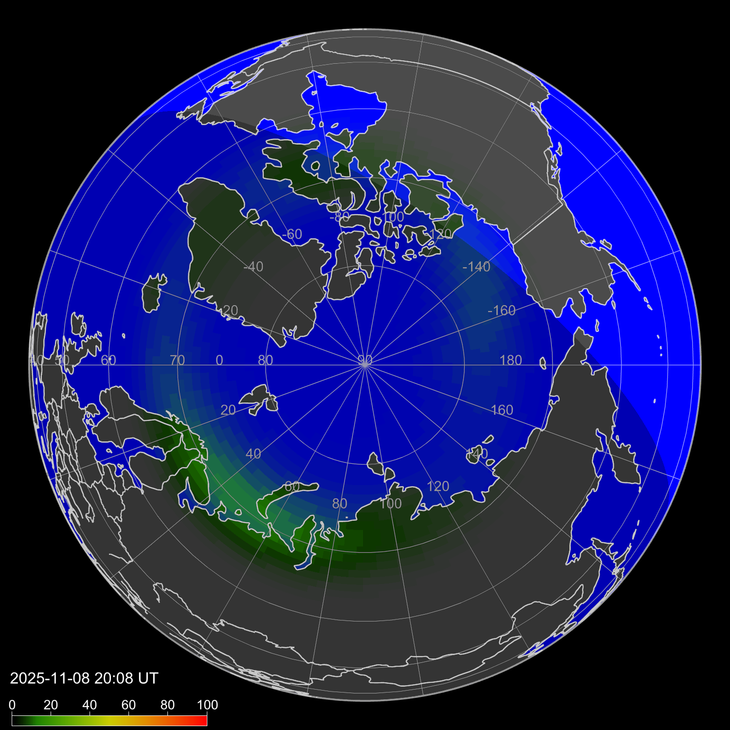 Изменения и часовой прогноз индекса интенсивности полярных сияний с 2025-11-07 по 2025-11-08
