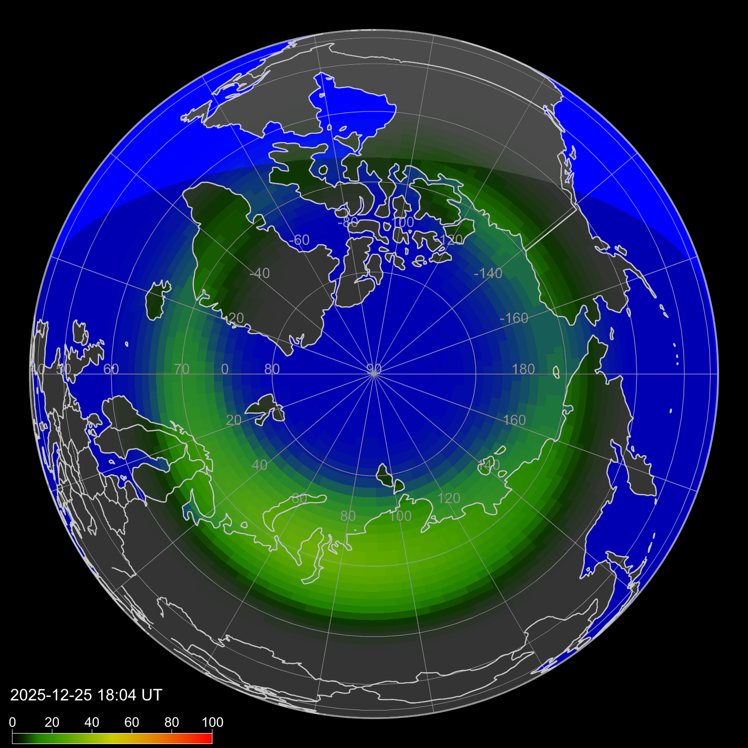 Изменения и часовой прогноз индекса интенсивности полярных сияний с 2025-12-24 по 2025-12-25