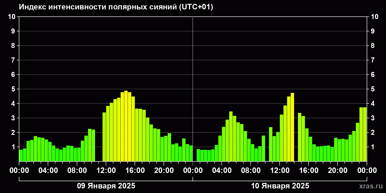 Изменения индекса интенсивности полярных сияний с 2025-01-09 по 2025-01-10 по местному времени