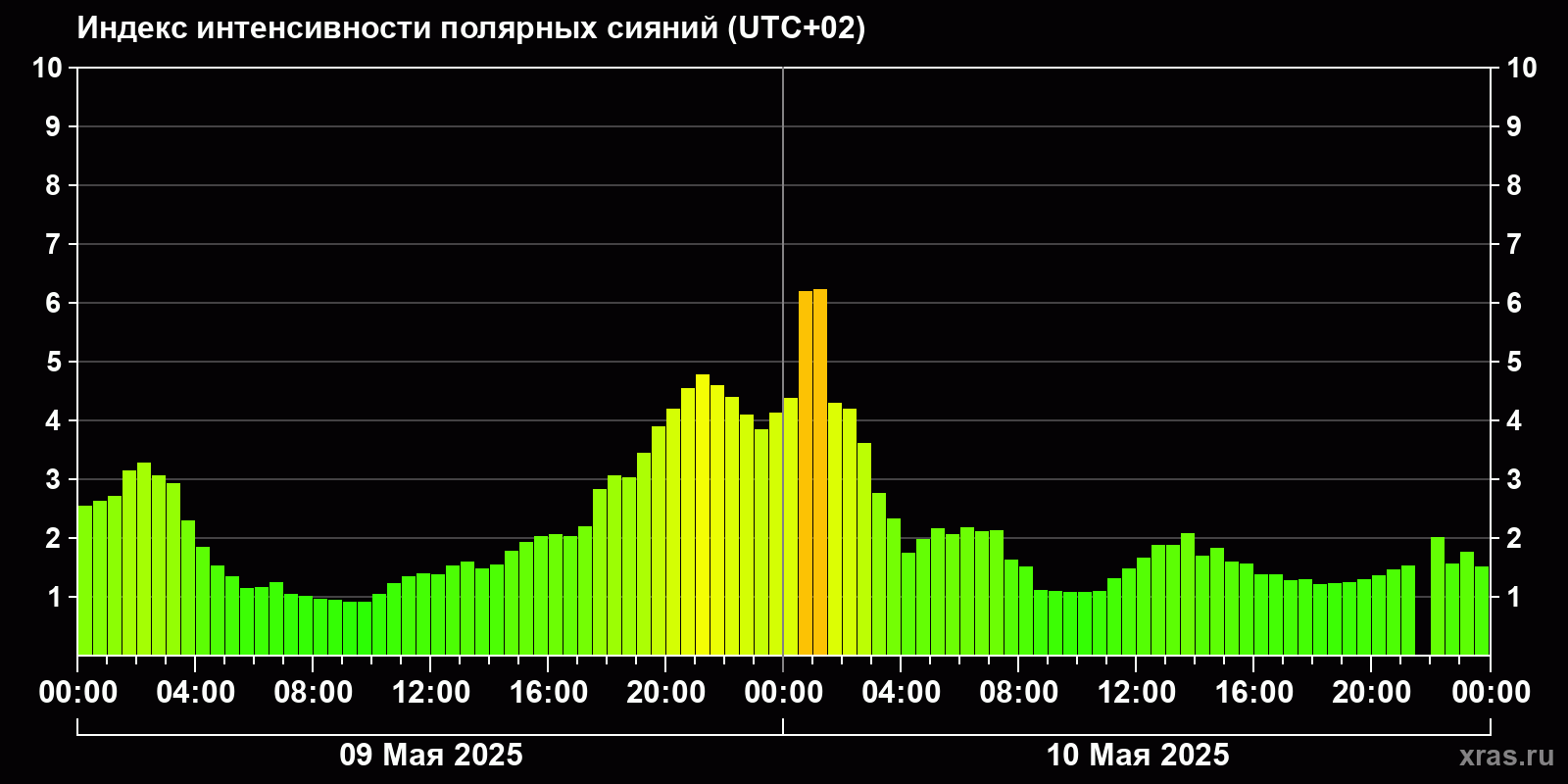 Изменения индекса интенсивности полярных сияний с 2025-05-09 по 2025-05-10 по местному времени
