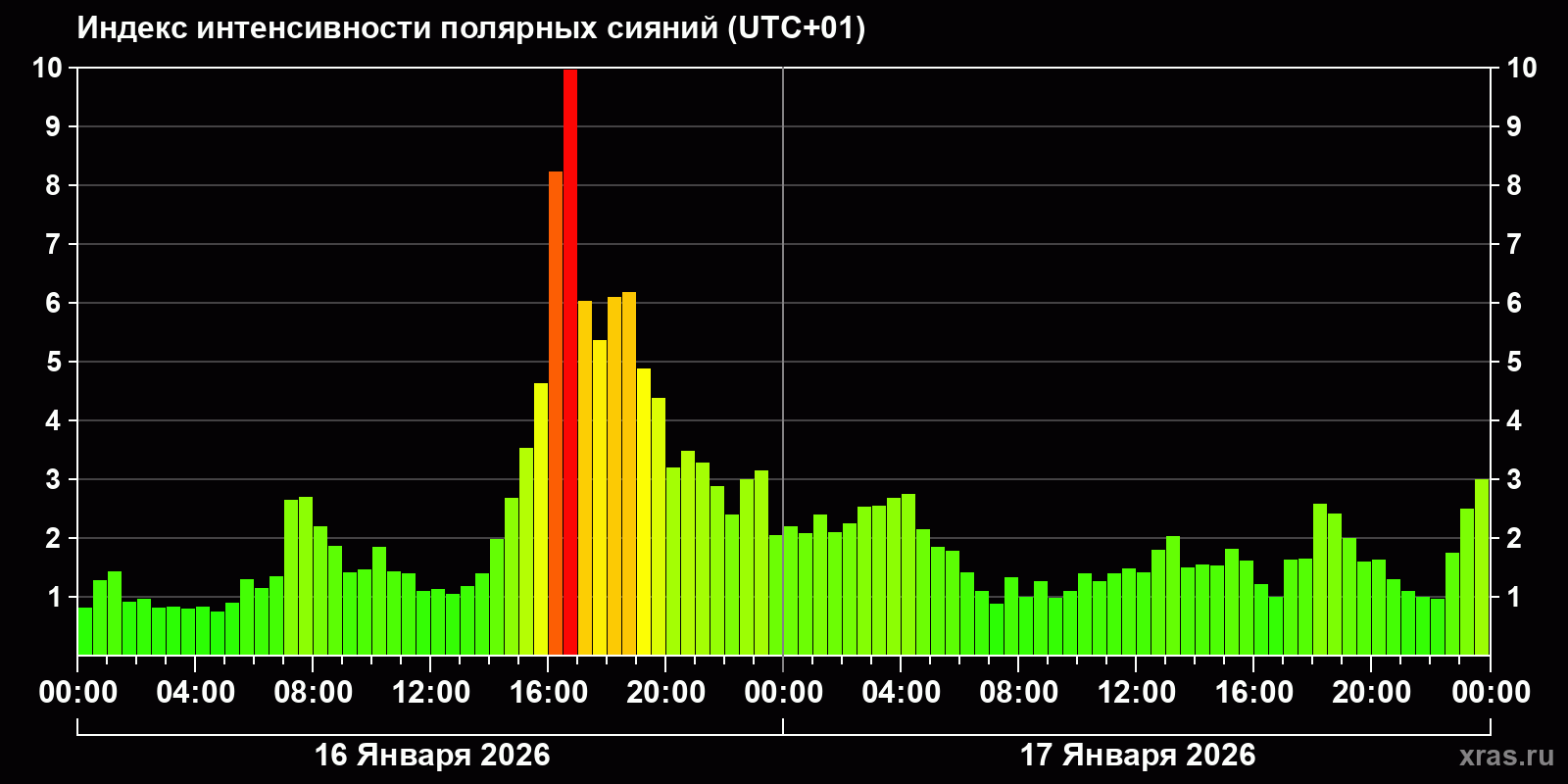Изменения индекса интенсивности полярных сияний с 2026-01-16 по 2026-01-17 по местному времени