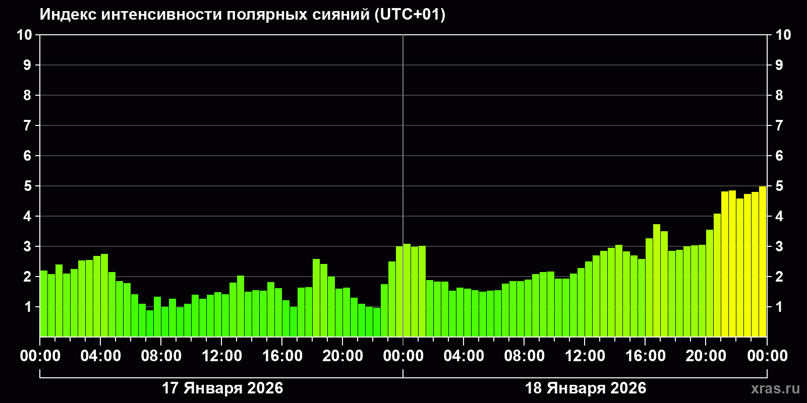 Изменения индекса интенсивности полярных сияний с 2026-01-17 по 2026-01-18 по местному времени
