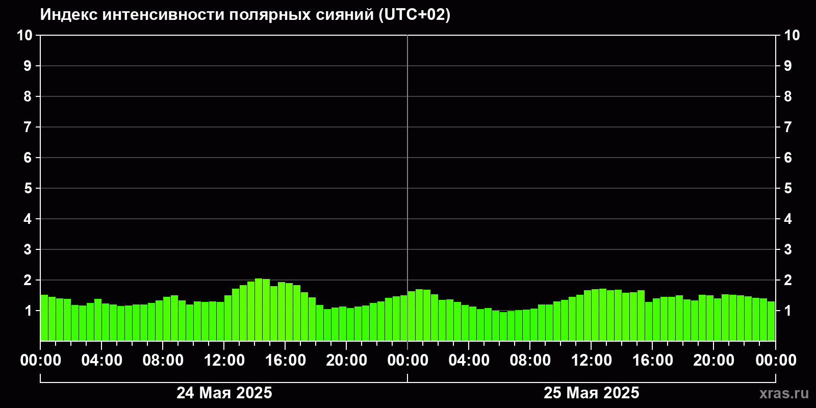 Изменения индекса интенсивности полярных сияний с 2025-05-24 по 2025-05-25 по местному времени