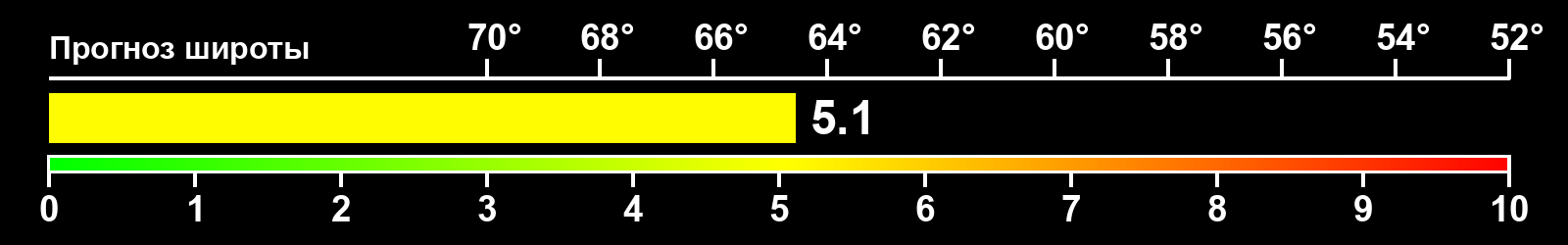 Индекс интенсивности полярных сияний и теоретически возможная широта наблюдений для ночного времени в восточном полушарии по состоянию на 2025-12-03 23:54 (конец дня) по местному времени