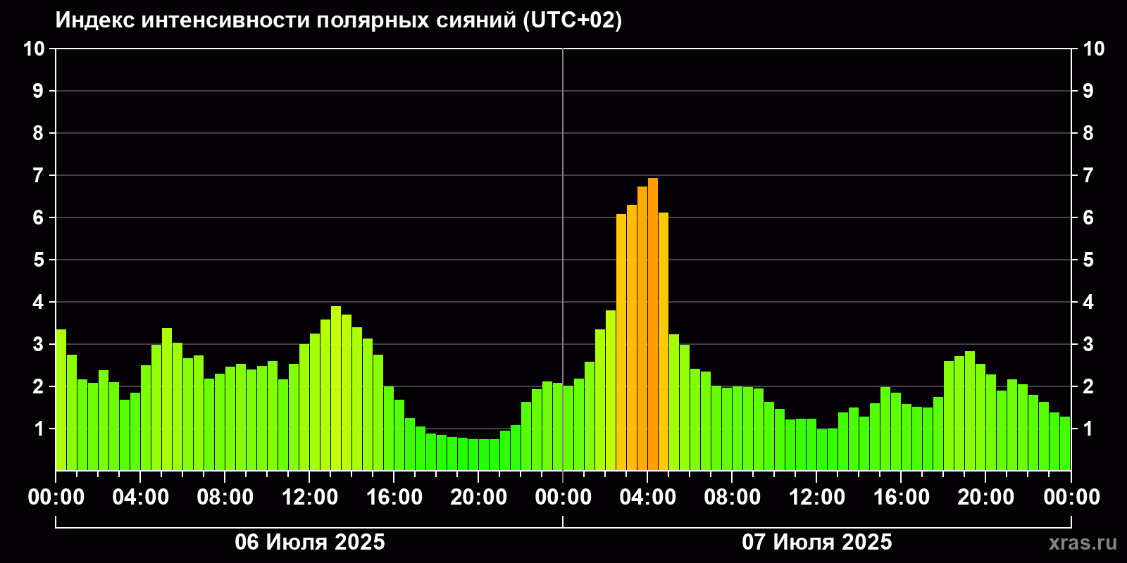 Изменения индекса интенсивности полярных сияний с 2025-07-06 по 2025-07-07 по местному времени