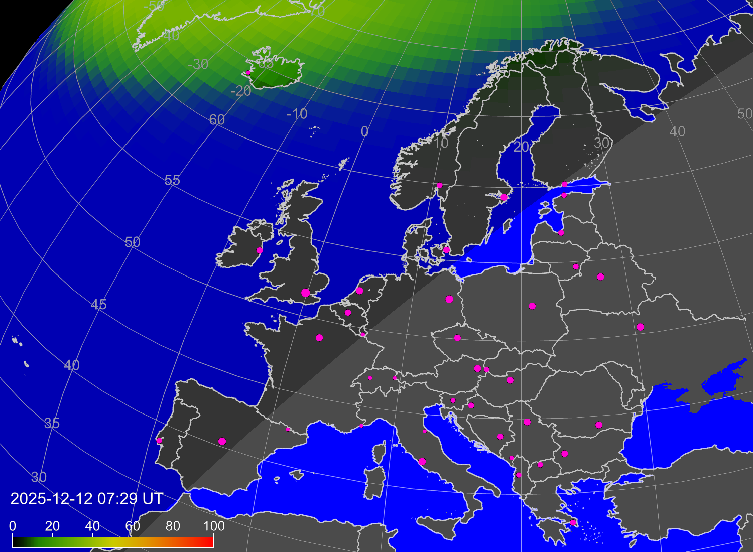 Вероятность полярных сияний в городах Европы