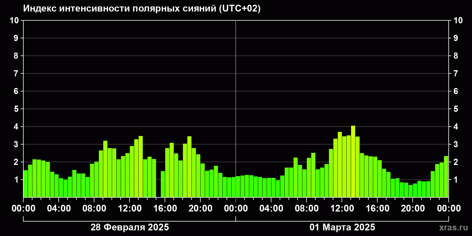 Изменения индекса интенсивности полярных сияний с 2025-02-28 по 2025-03-01 по местному времени