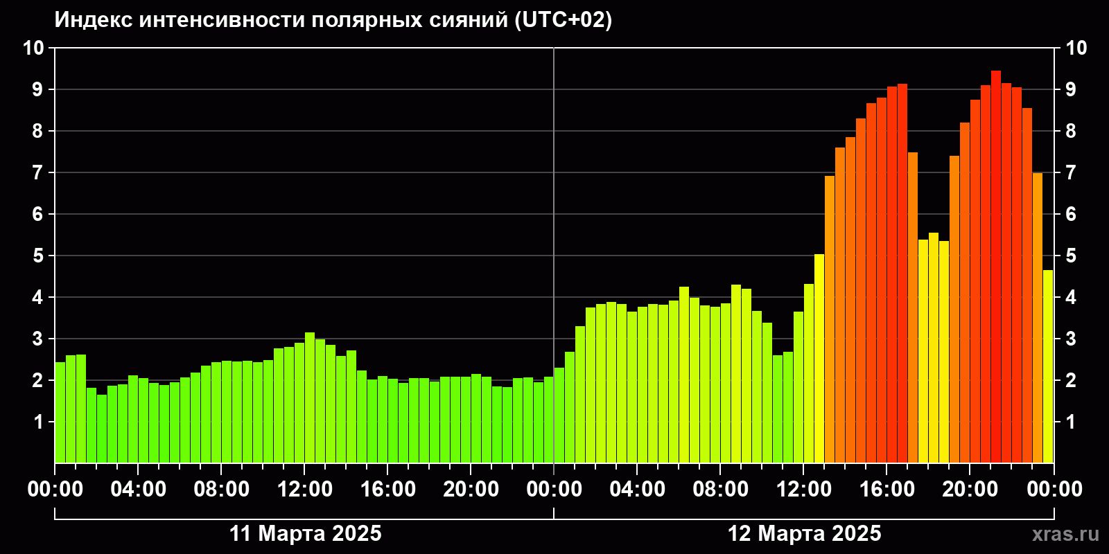 Изменения индекса интенсивности полярных сияний с 2025-03-11 по 2025-03-12 по местному времени