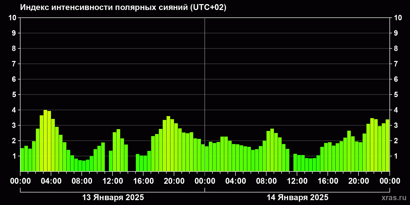Изменения индекса интенсивности полярных сияний с 2025-01-13 по 2025-01-14 по местному времени