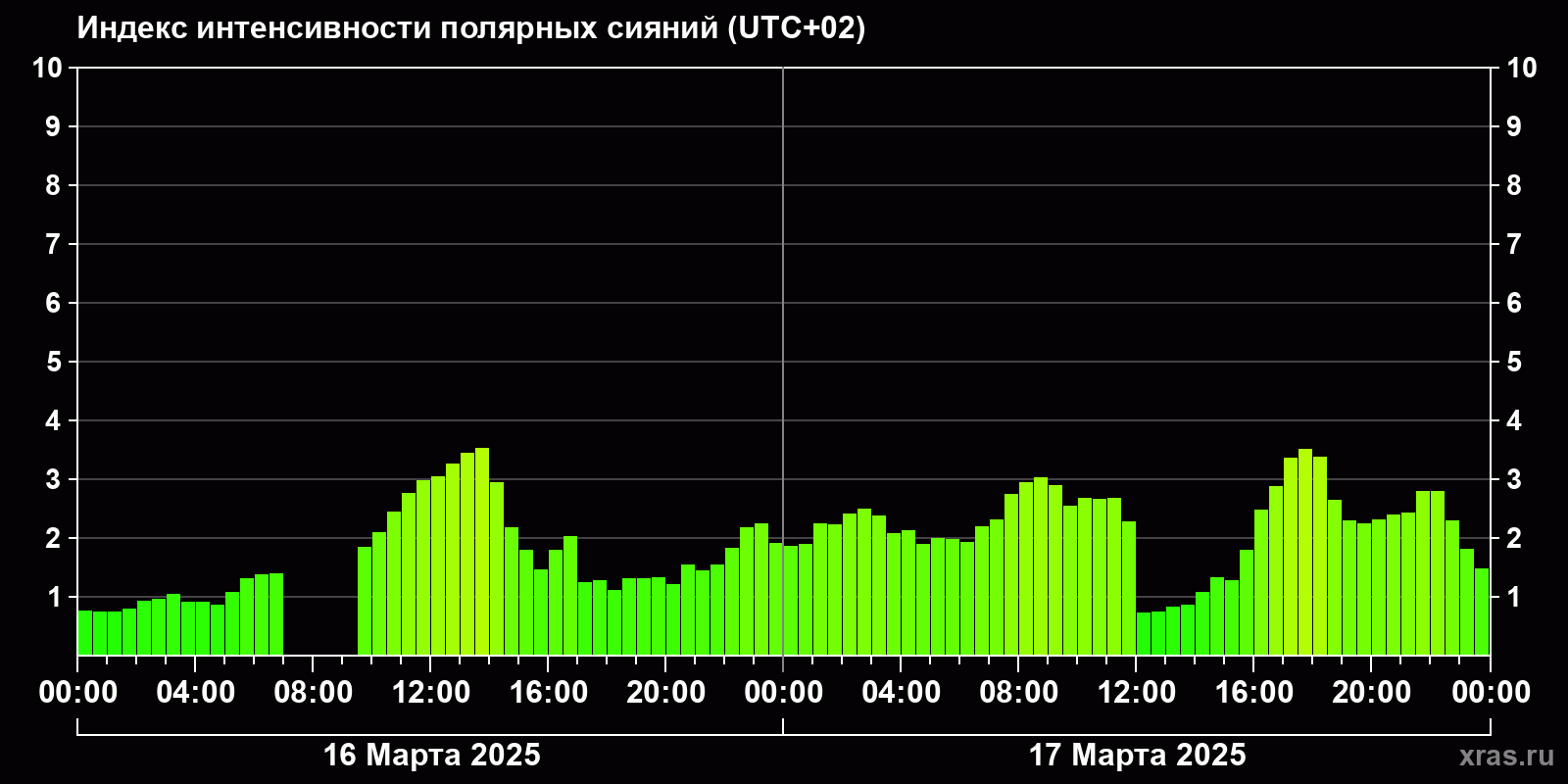 Изменения индекса интенсивности полярных сияний с 2025-03-16 по 2025-03-17 по местному времени