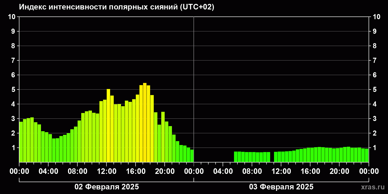 Изменения индекса интенсивности полярных сияний с 2025-02-02 по 2025-02-03 по местному времени