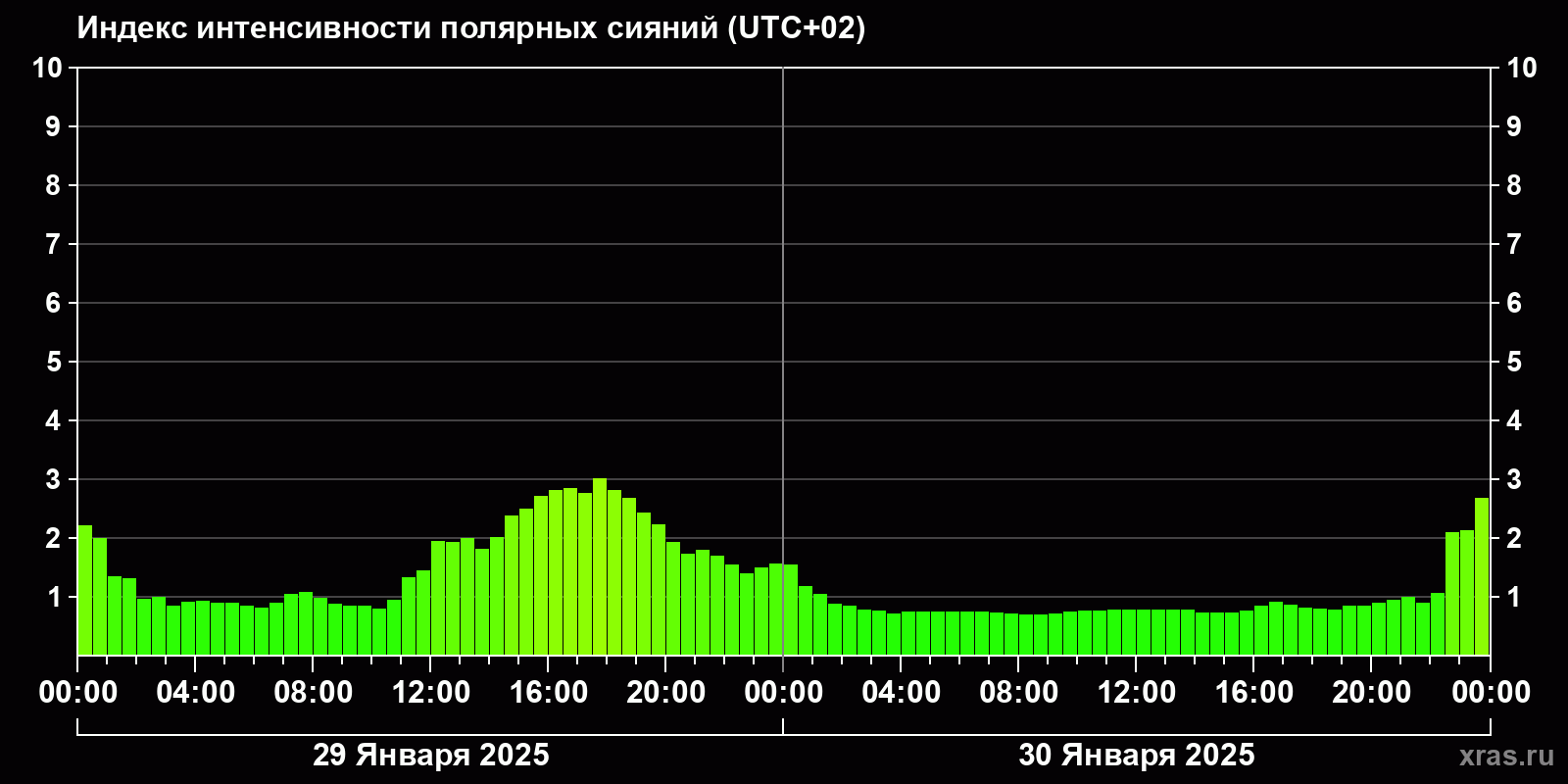 Изменения индекса интенсивности полярных сияний с 2025-01-29 по 2025-01-30 по местному времени