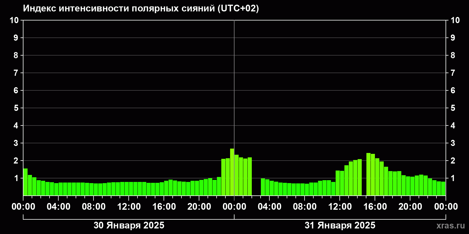 Изменения индекса интенсивности полярных сияний с 2025-01-30 по 2025-01-31 по местному времени