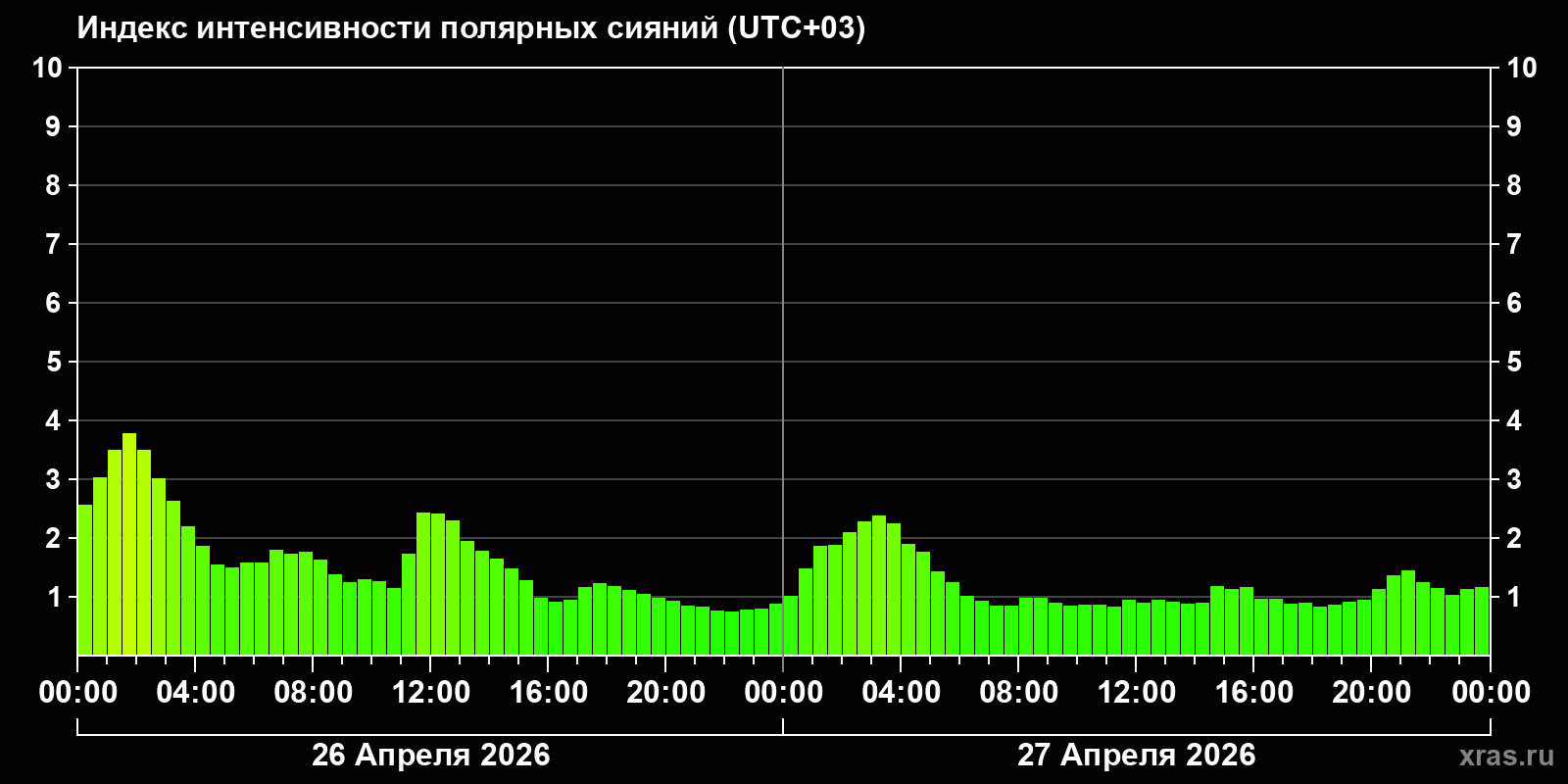 Изменения индекса интенсивности полярных сияний с 2026-04-26 по 2026-04-27 по местному времени