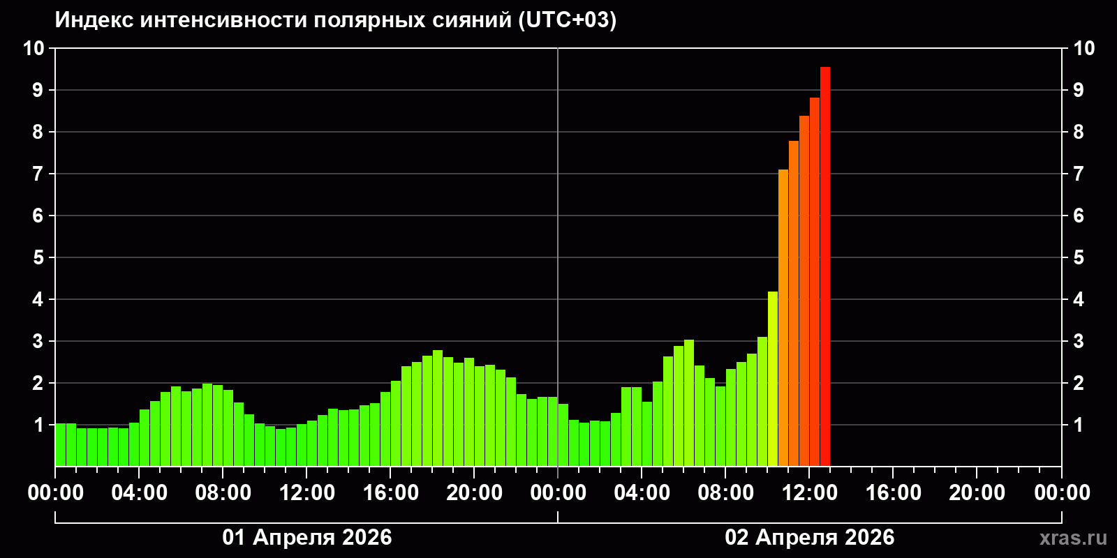 Изменения индекса интенсивности полярных сияний с 2026-04-01 по 2026-04-02 по местному времени