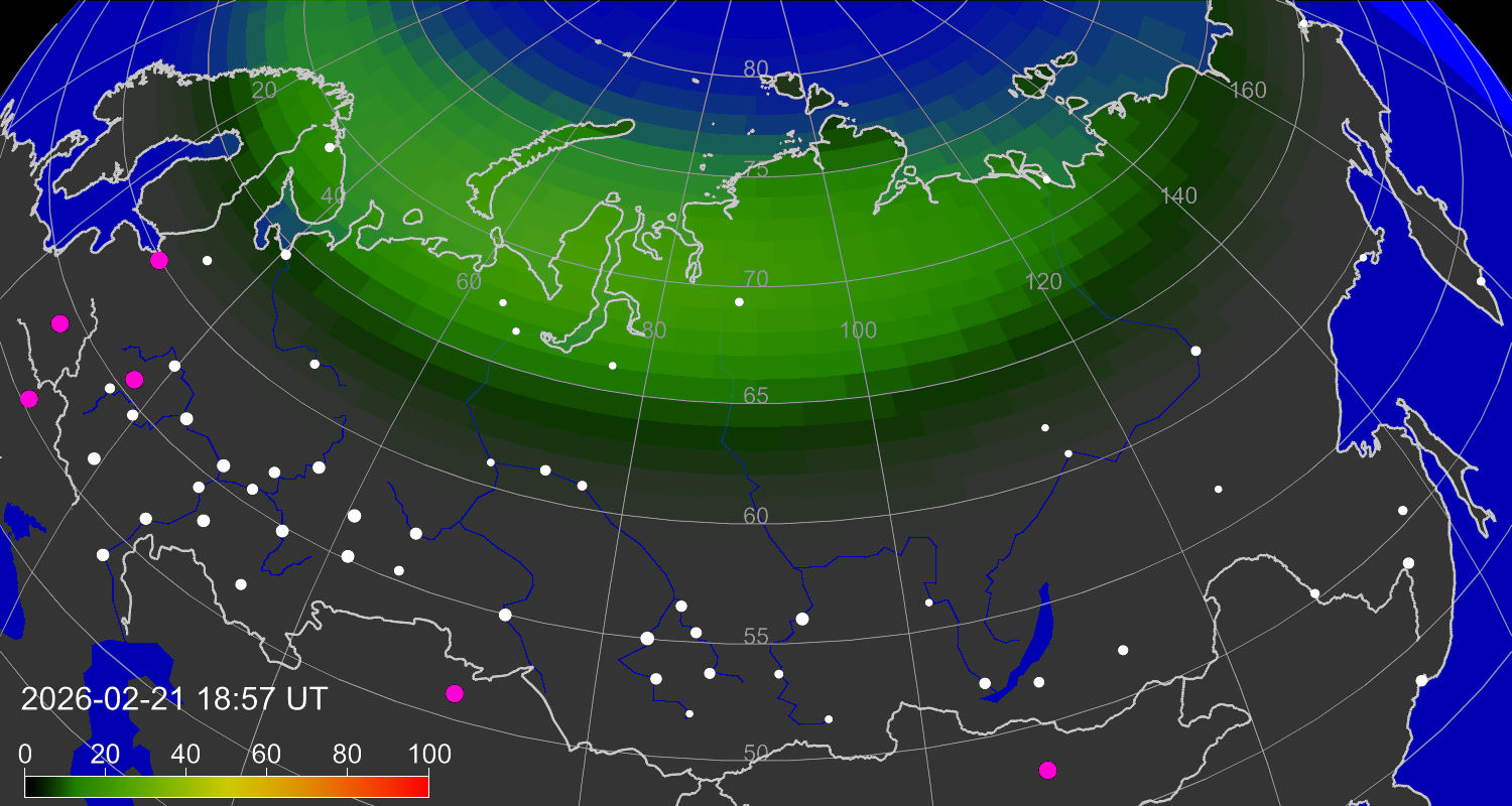 Изменения и часовой прогноз индекса интенсивности полярных сияний с 2026-02-21 по 2026-02-22