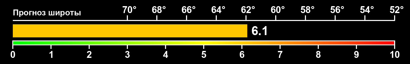 Индекс интенсивности полярных сияний и теоретически возможная широта наблюдений для ночного времени в восточном полушарии по состоянию на 2025-01-05 23:49 (конец дня) по местному времени