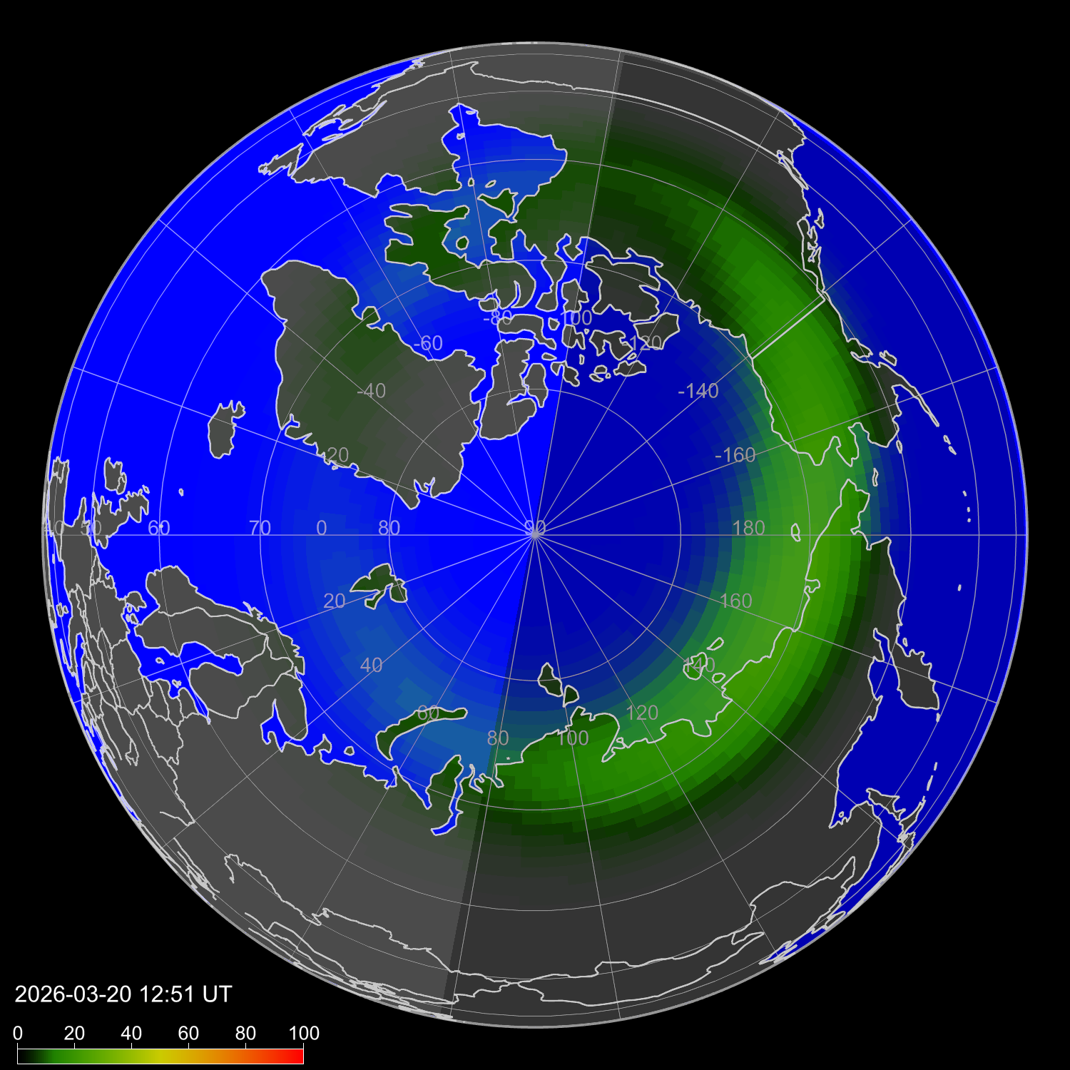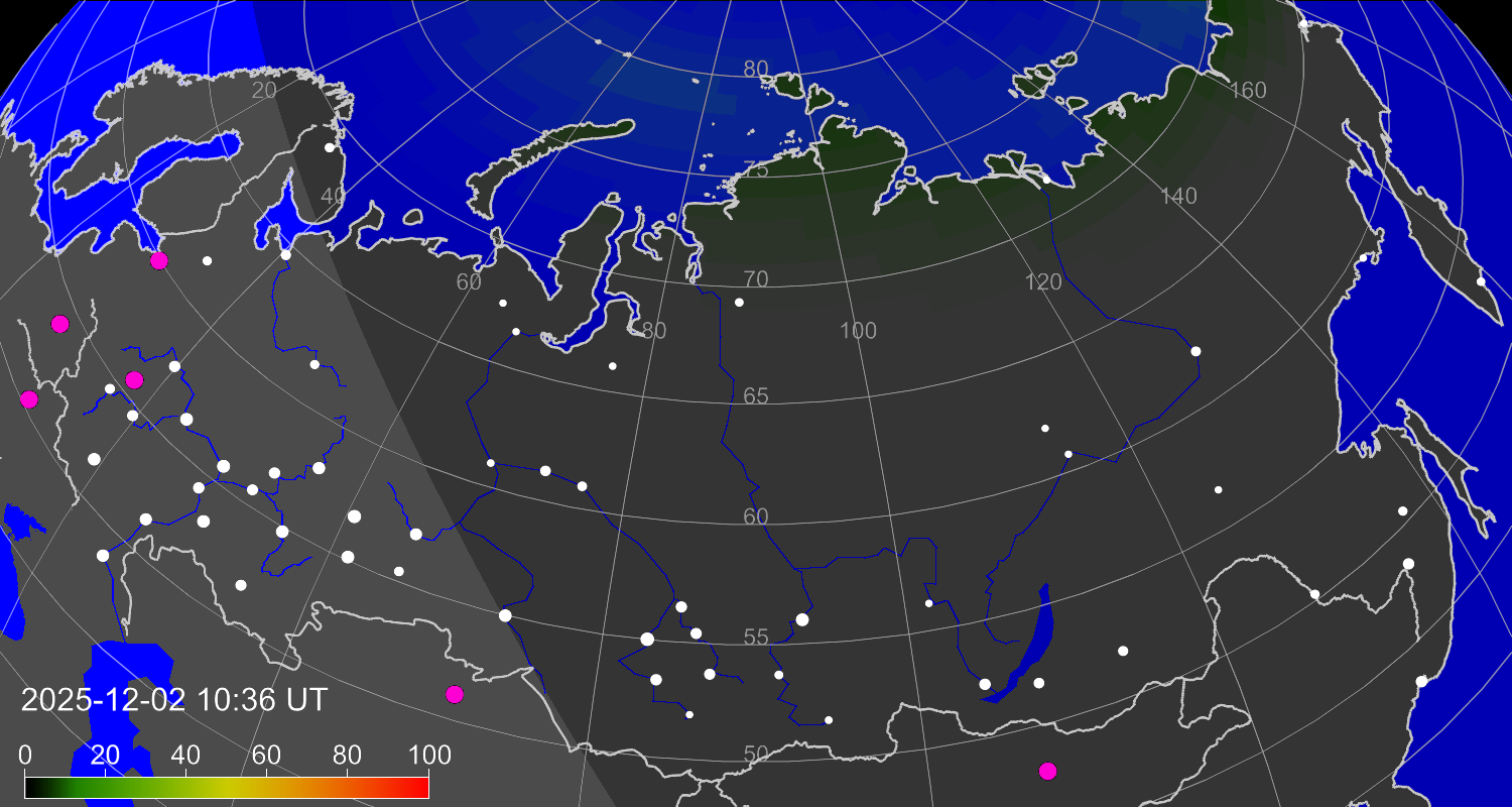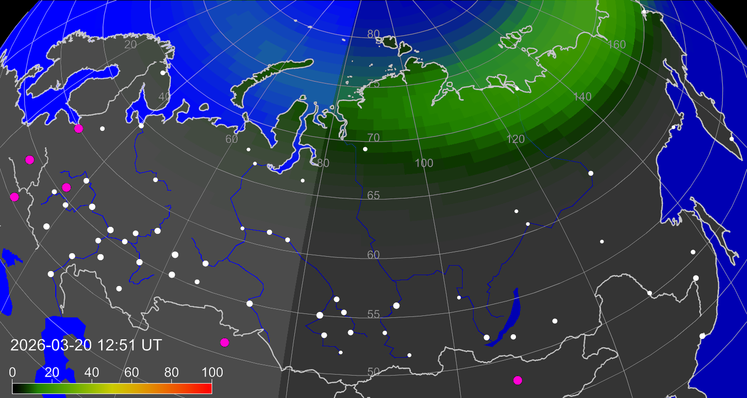 Индекс интенсивности полярных сияний и теоретически возможная широта наблюдений для ночного времени в восточном полушарии