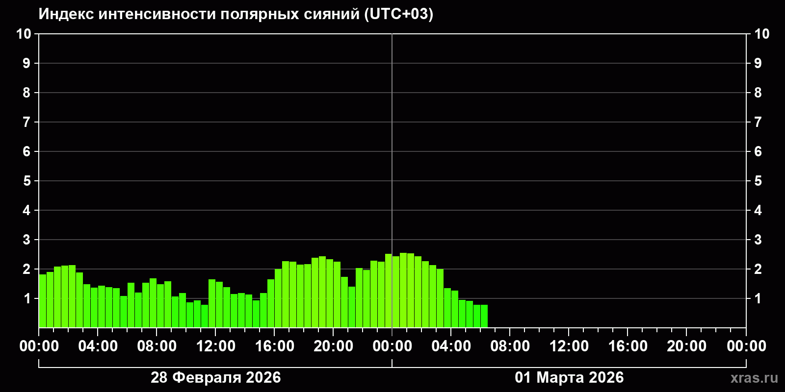 Изменения индекса интенсивности полярных сияний с 2026-02-28 по 2026-03-01 по местному времени