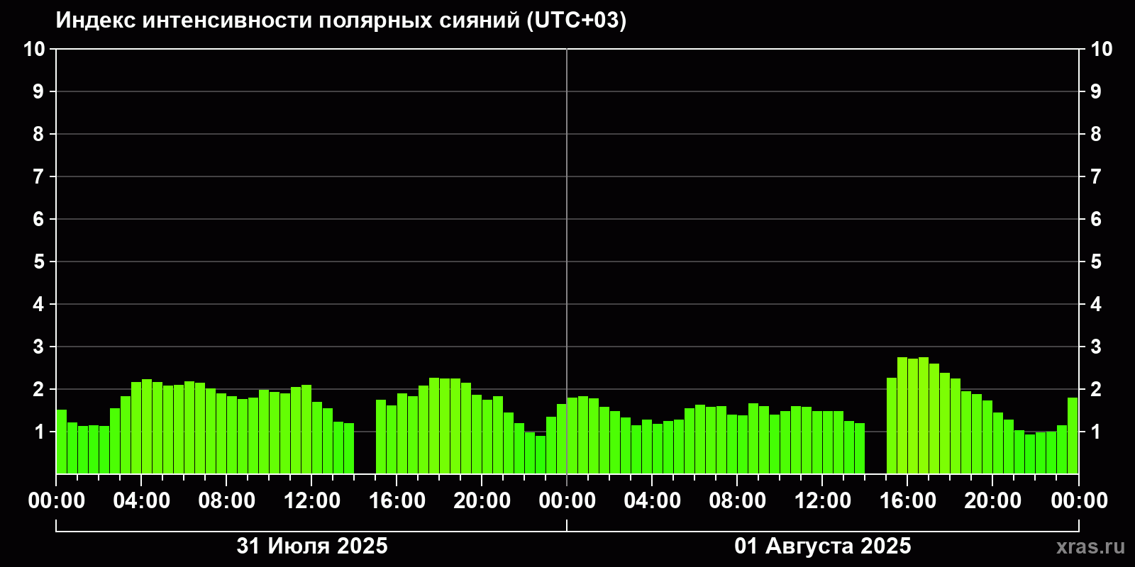 Изменения индекса интенсивности полярных сияний с 2025-07-31 по 2025-08-01 по местному времени