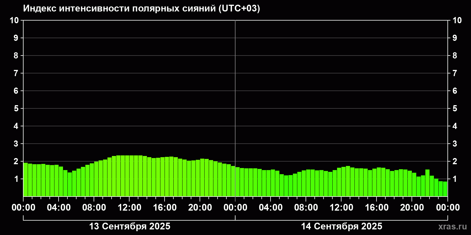 Изменения индекса интенсивности полярных сияний с 2025-09-13 по 2025-09-14 по местному времени