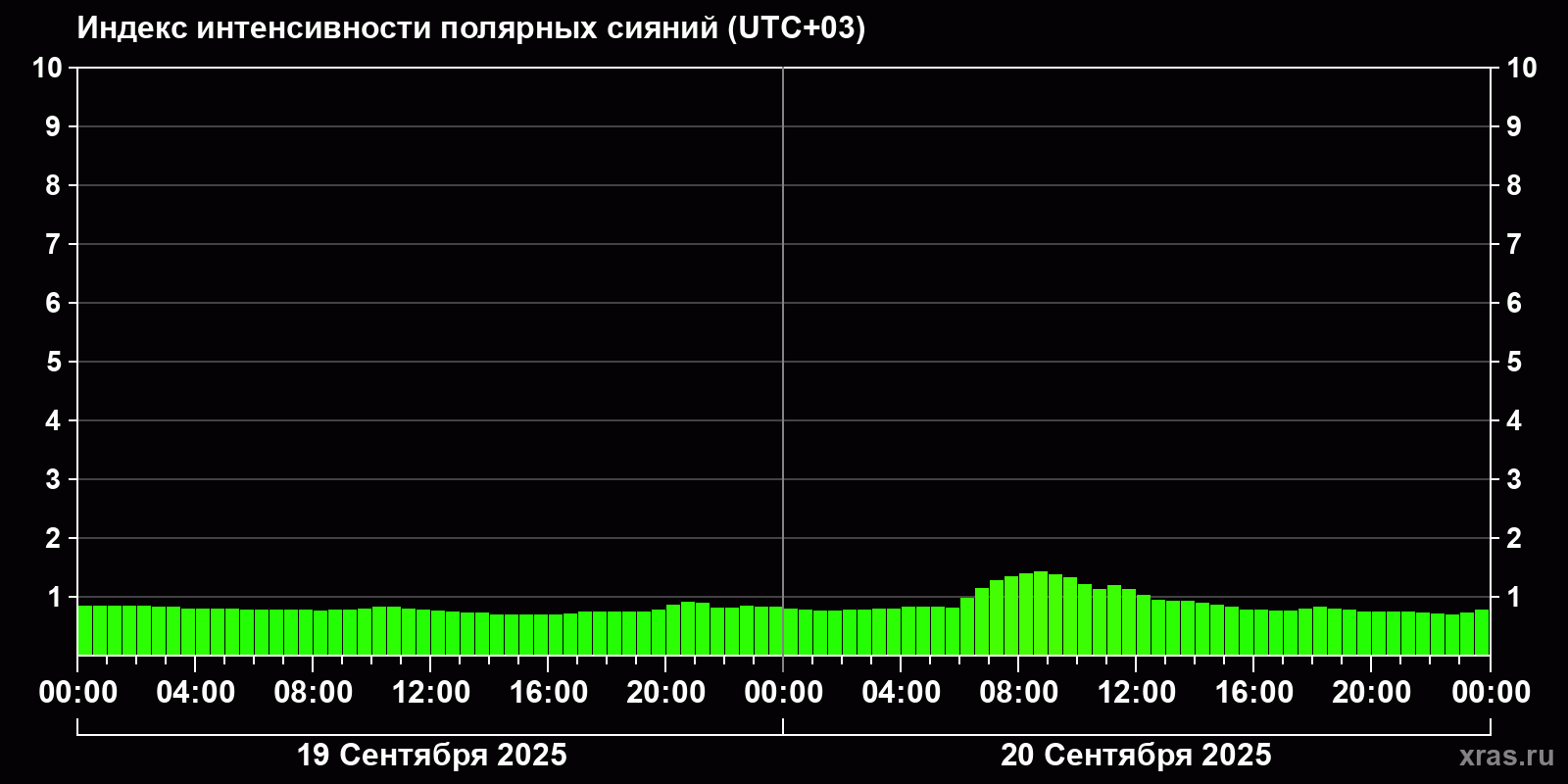 Изменения индекса интенсивности полярных сияний с 2025-09-19 по 2025-09-20 по местному времени