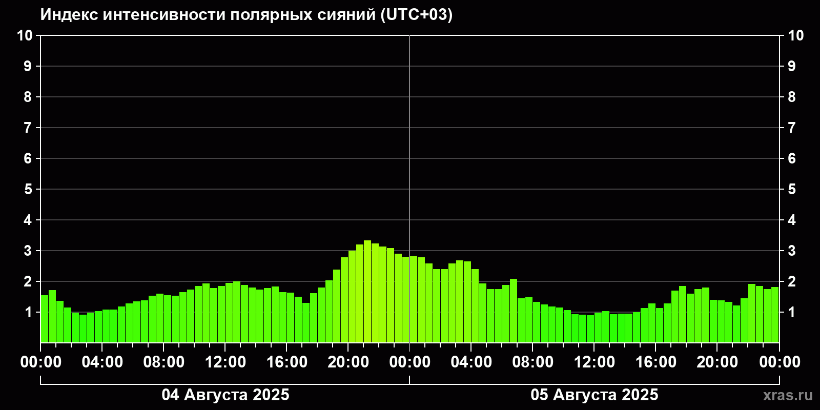Изменения индекса интенсивности полярных сияний с 2025-08-04 по 2025-08-05 по местному времени
