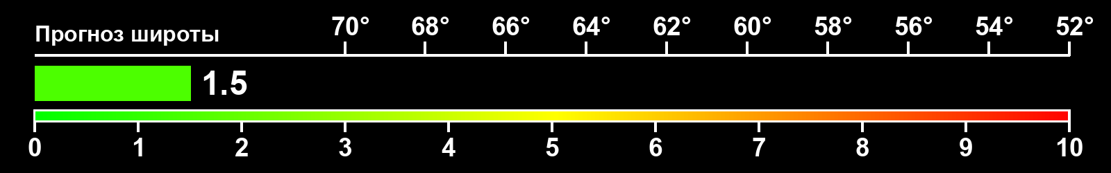 Индекс интенсивности полярных сияний и теоретически возможная широта наблюдений для ночного времени в восточном полушарии по состоянию на 2026-03-08 23:51 (конец дня) по местному времени