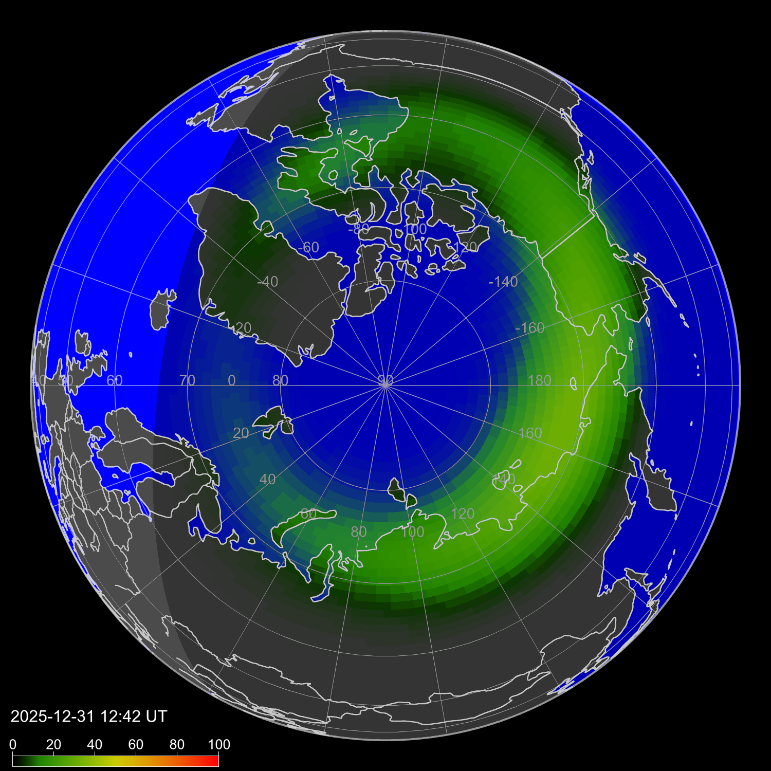 Изменения и часовой прогноз индекса интенсивности полярных сияний с 2025-12-31 по 2026-01-01