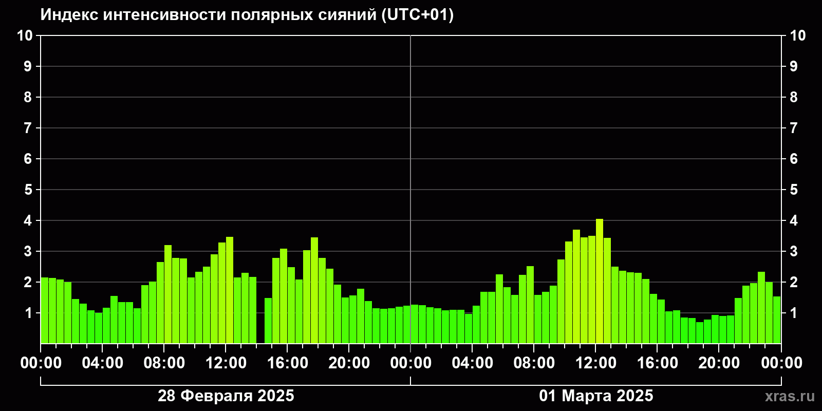 Изменения индекса интенсивности полярных сияний с 2025-02-28 по 2025-03-01 по местному времени