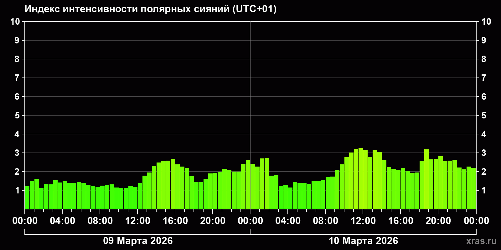 Изменения индекса интенсивности полярных сияний с 2026-03-09 по 2026-03-10 по местному времени