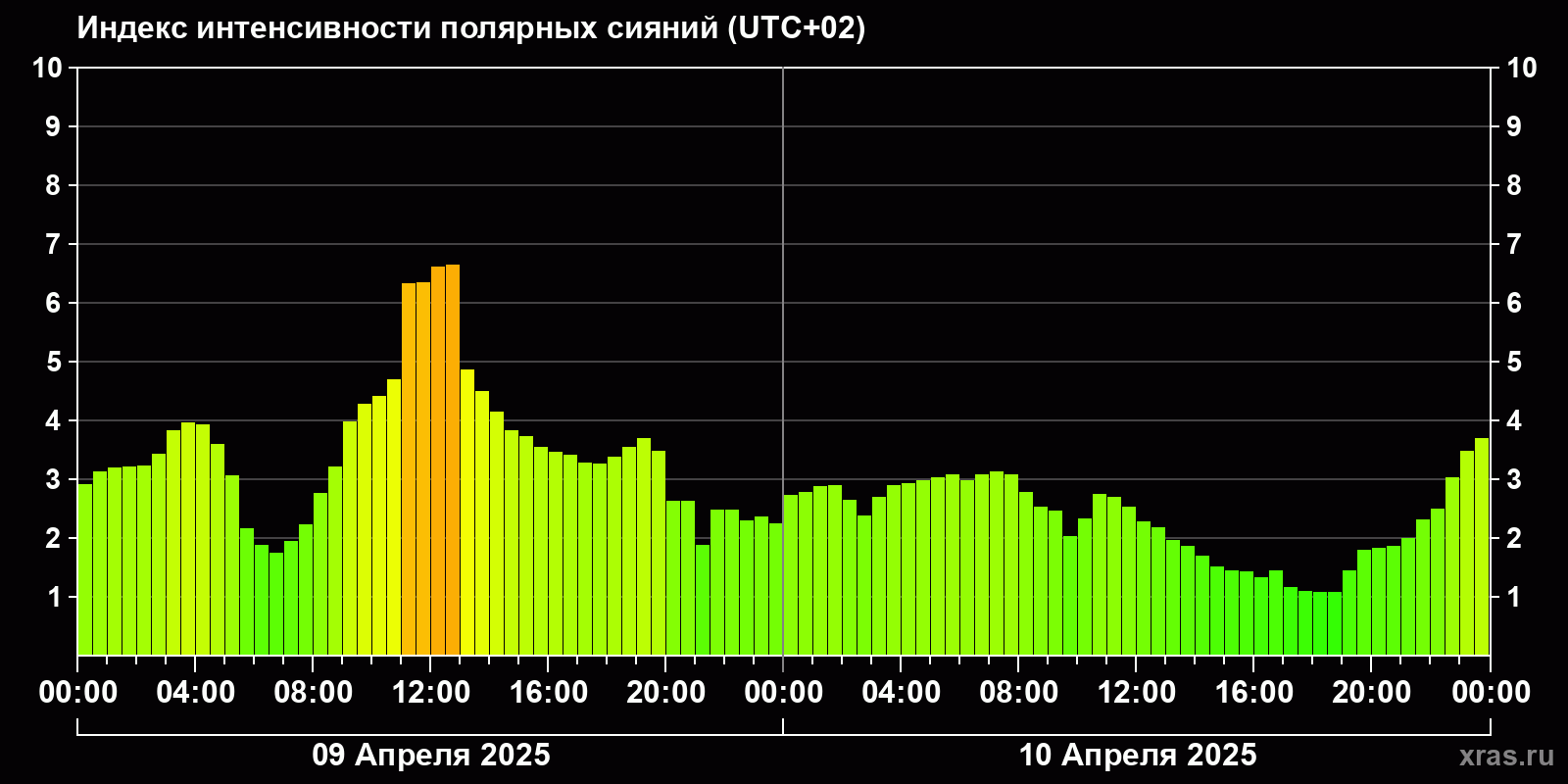 Изменения индекса интенсивности полярных сияний с 2025-04-09 по 2025-04-10 по местному времени