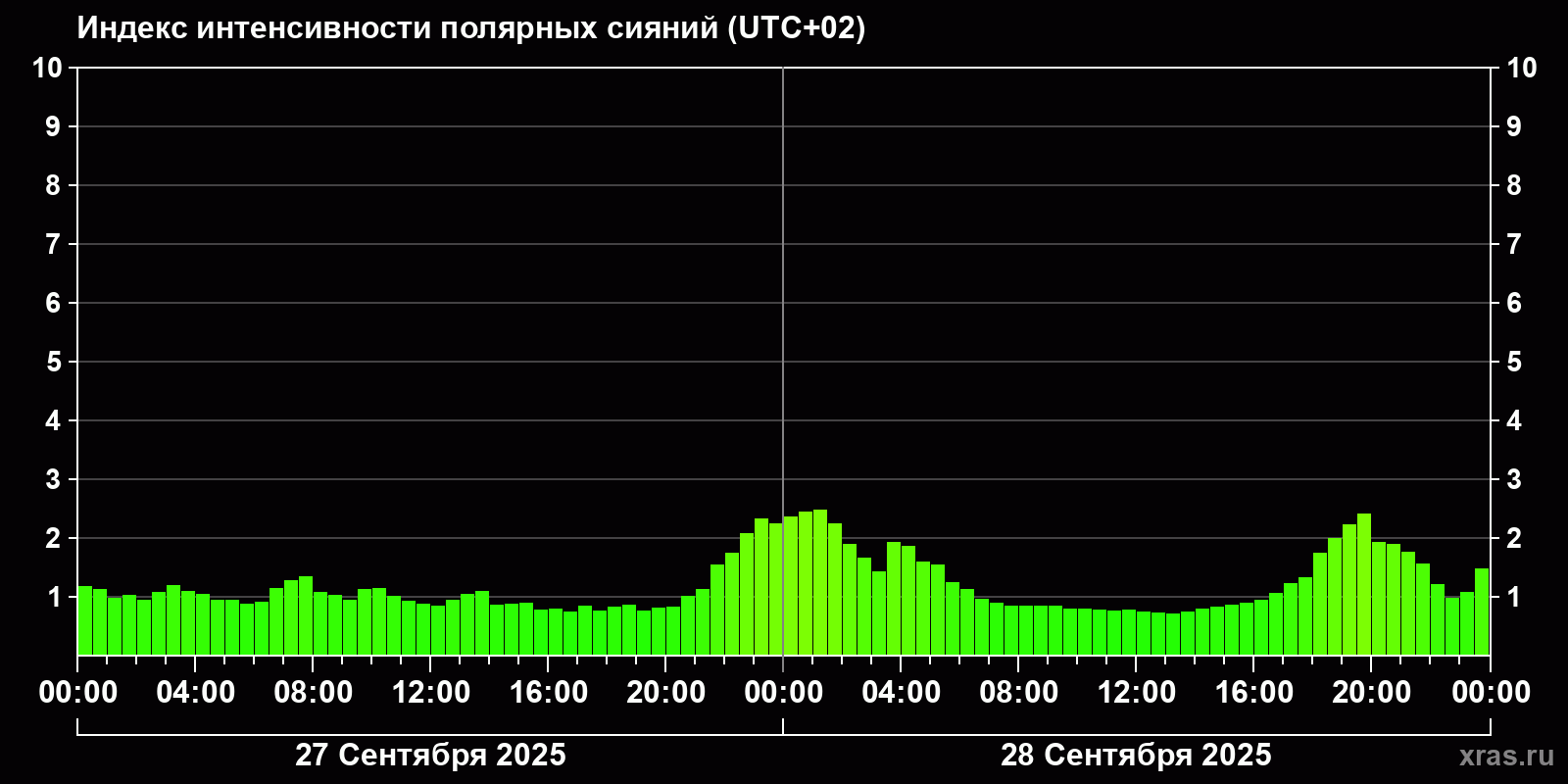 Изменения индекса интенсивности полярных сияний с 2025-09-27 по 2025-09-28 по местному времени