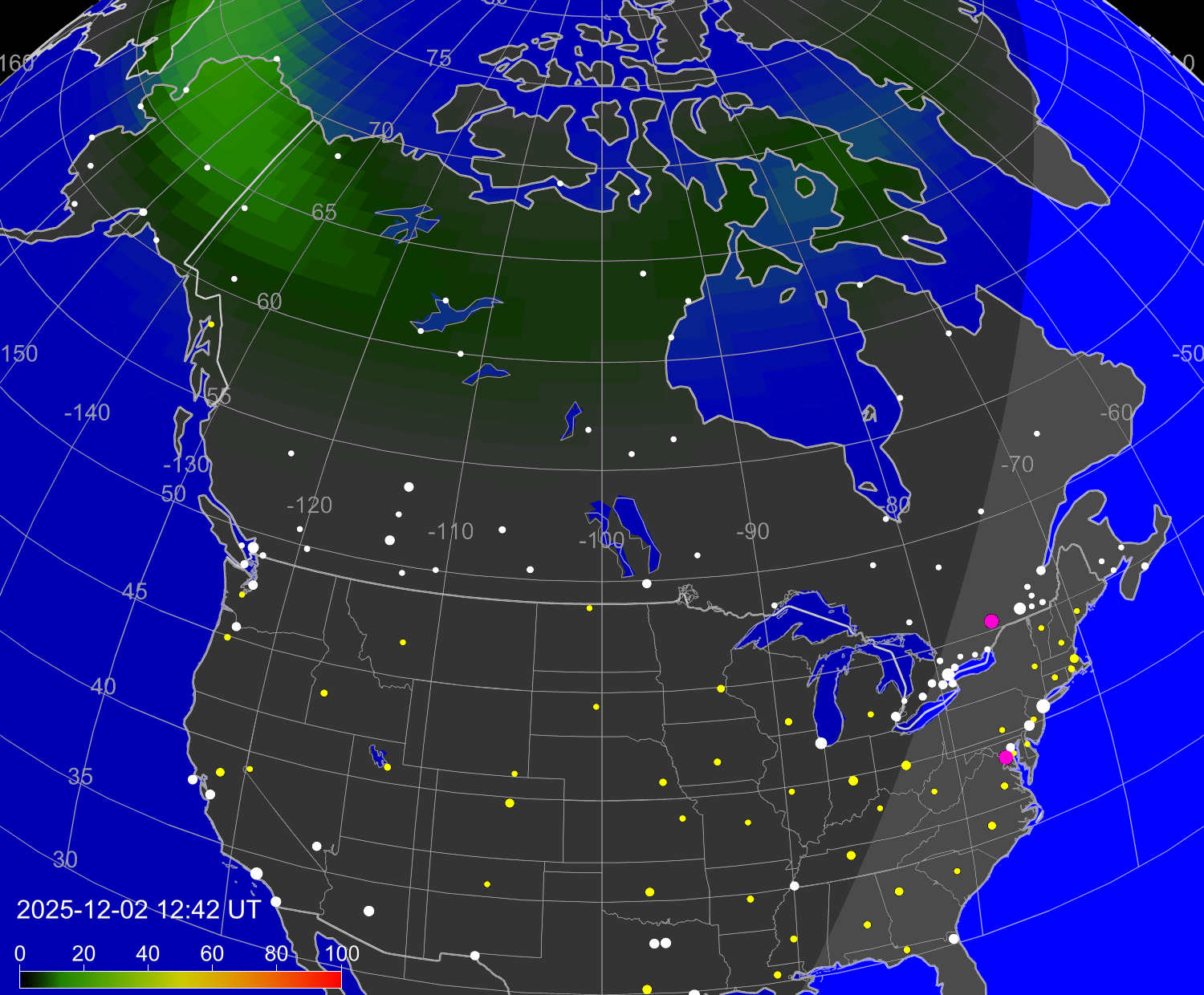 Изменения и часовой прогноз индекса интенсивности полярных сияний с 2025-11-30 по 2025-12-01
