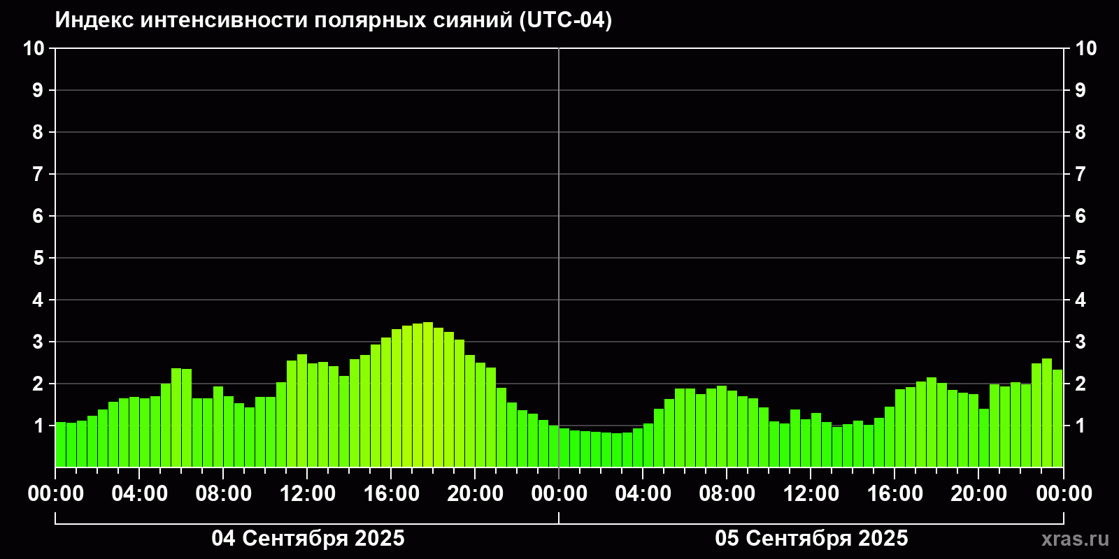 Изменения индекса интенсивности полярных сияний с 2025-09-04 по 2025-09-05 по местному времени