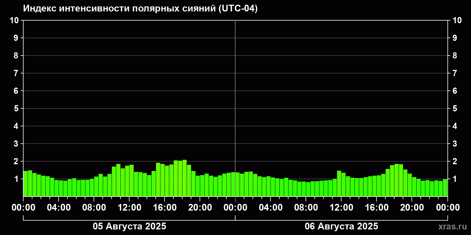 Изменения индекса интенсивности полярных сияний с 2025-08-05 по 2025-08-06 по местному времени