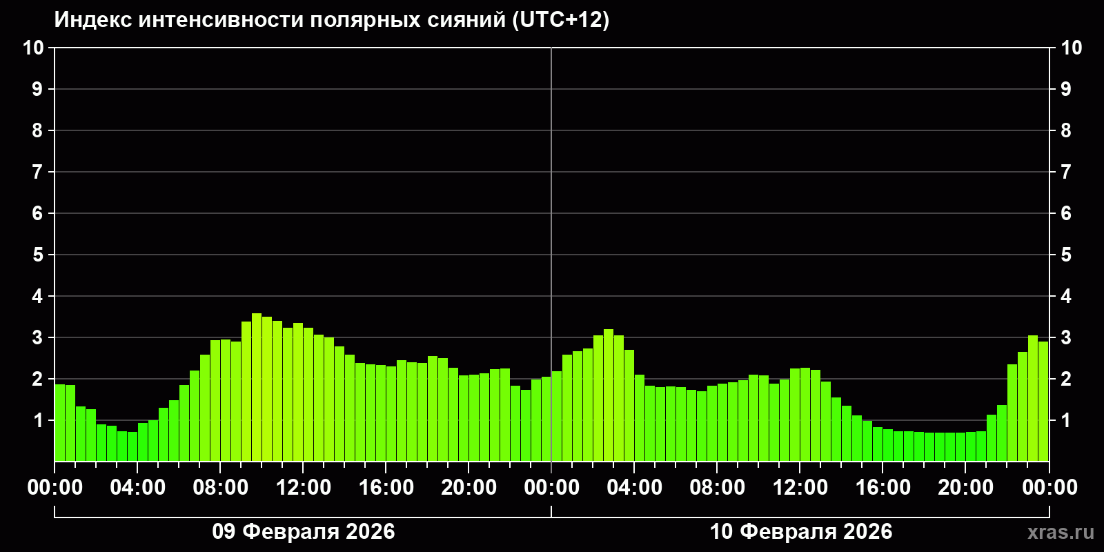 Изменения индекса интенсивности полярных сияний с 2026-02-09 по 2026-02-10 по местному времени